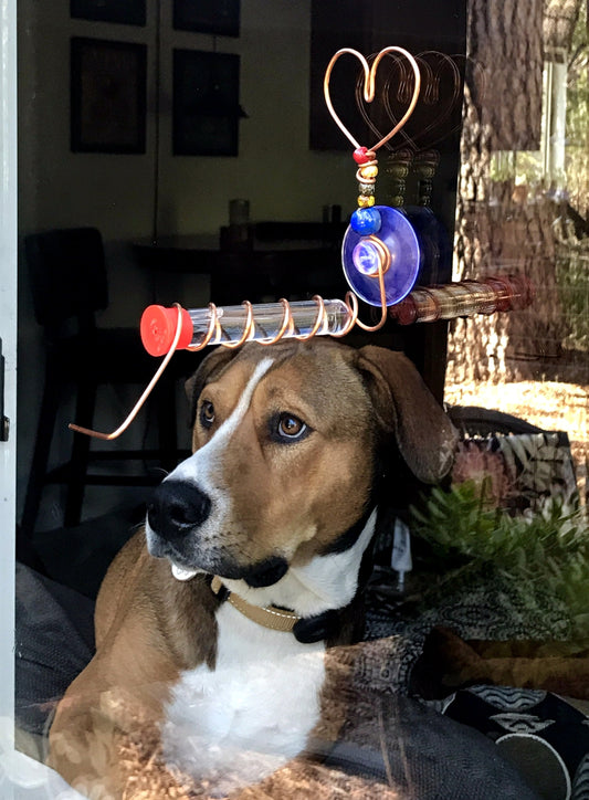 Copper Heart Test Tube Window hummingbird feeder, suction cup mount.
