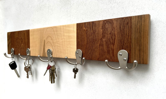 Mixed hardwood rack for wall, entryway organizer, leash hanger.