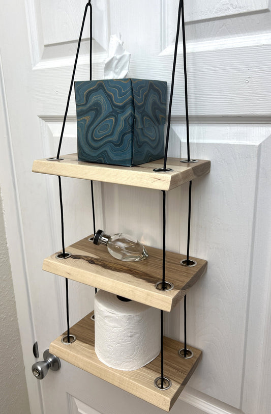 Hanging rope shelf, solid hickory wood, 3 tier.
