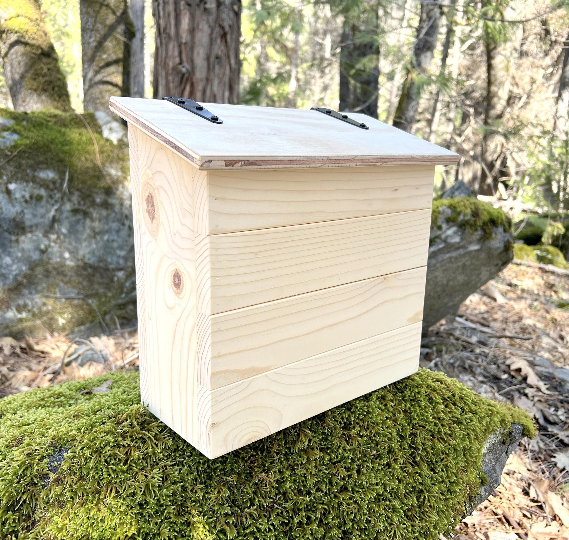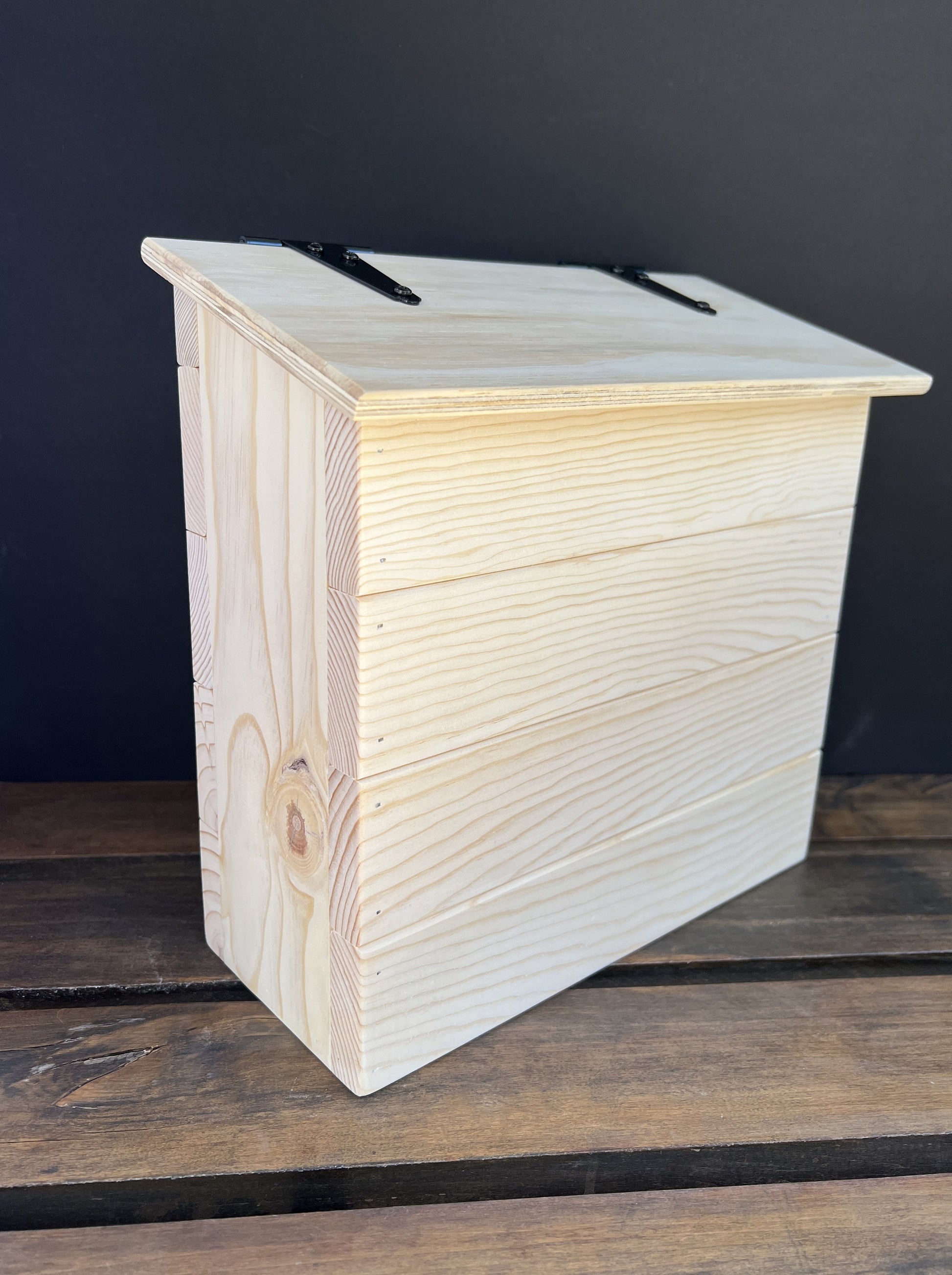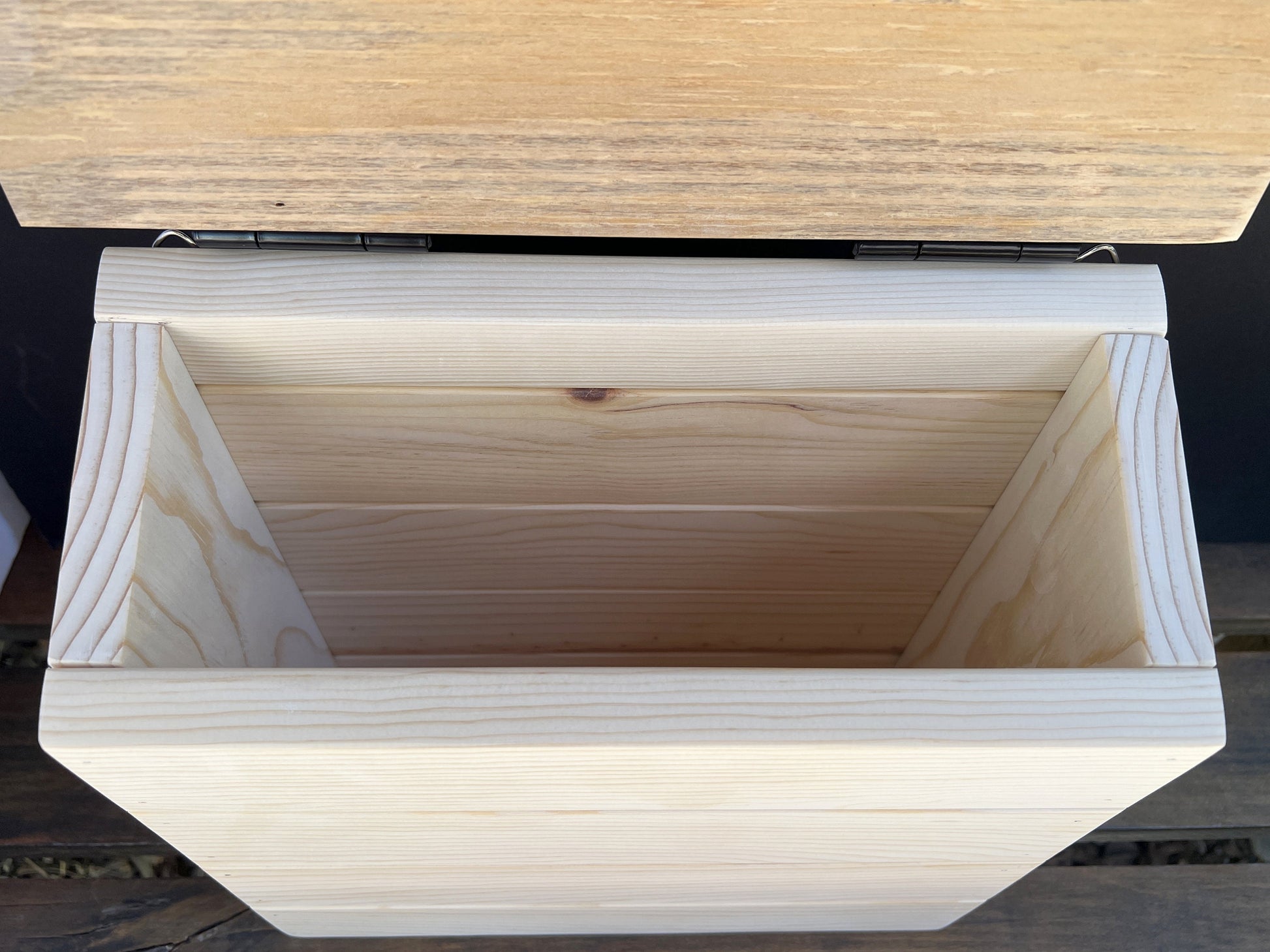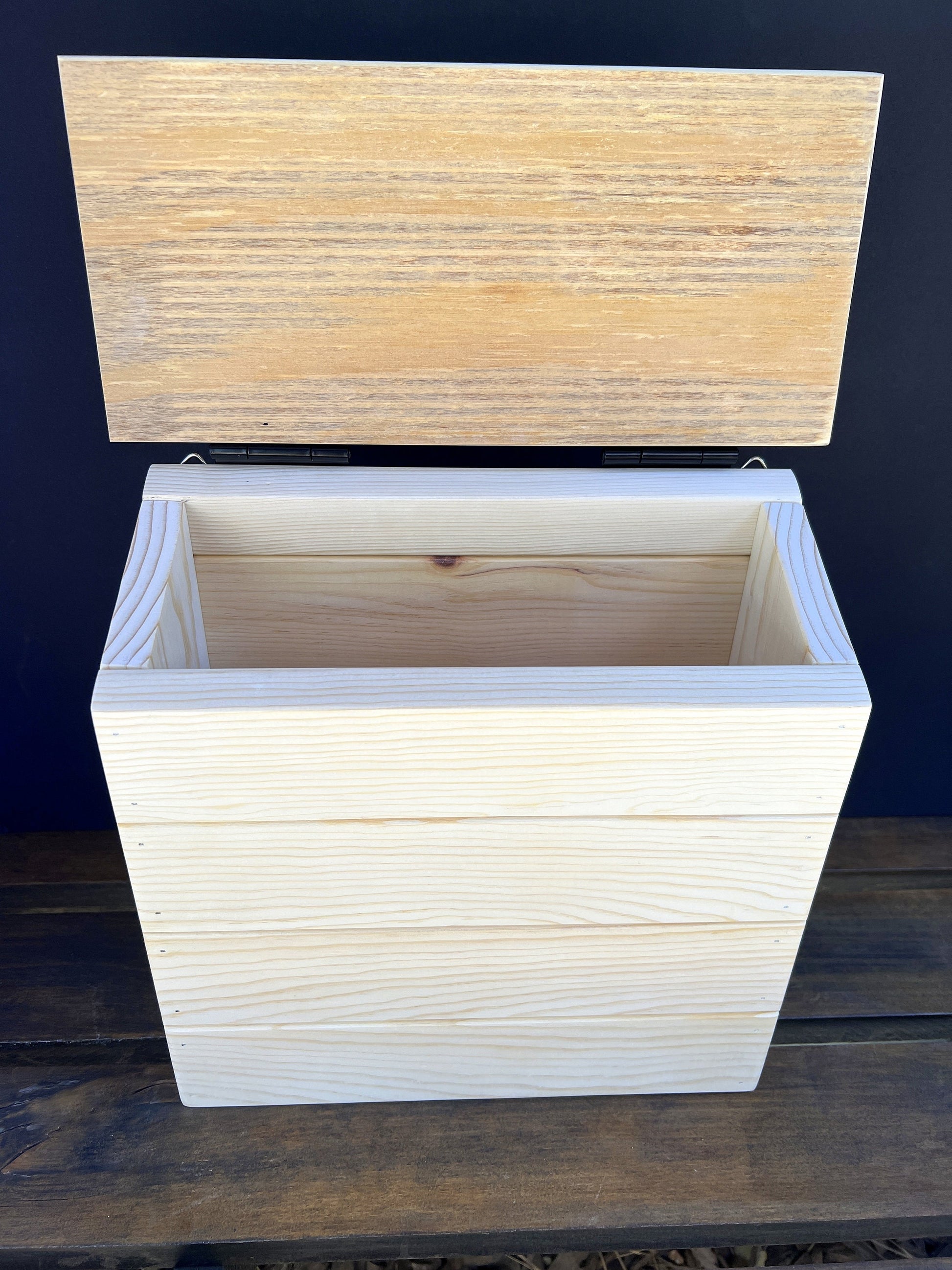 Wall mount mailbox made of pine wood and plywood lid. Hardware will be attached but not be glued, so it can be easily removed for staining or painting. New model which is lighter weight!